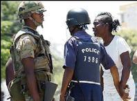 Members of the security forces mediate in a dispute between a woman (second right) and another (hidden) in the Wilton Gardens 'Rema' Community on last month.- RICARDO MAKYN/STAFF PHOTOGRAPHER