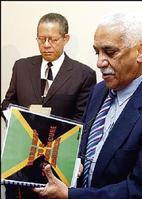 Bruce Golding (left), Leader of the Opposition, and Colonel Trevor MacMillan, former Commissioner of Police, examine the report put together by the Special Task Force on Crime (STFC), at a press conference held recently at the Jamaica Pegasus, New Kingston. The STFC, headed by Col. MacMillan, was convened by Golding last December.- RUDOLPH BROWN/CHIEF PHOTOGRAPHER